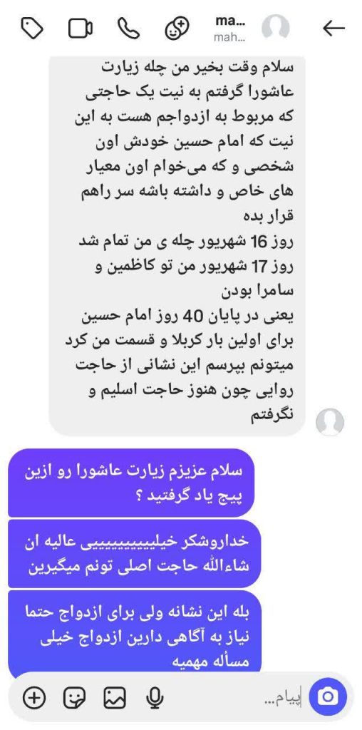 اگر در انتظار گشایش در امر ازدواج هستی, این بخش مخصوص توست. روایت های واقعی از چله زیارت عاشورا به روش آیت الله حق شناس و حاجت هایی که با توسل به سیدالشهدا علیه السلام برآورده شده اند.