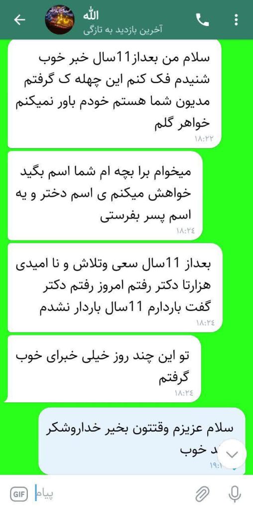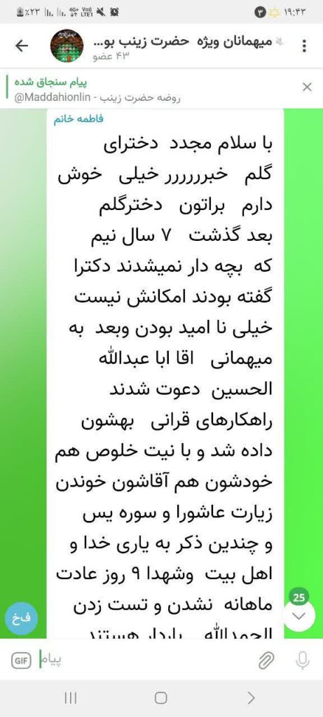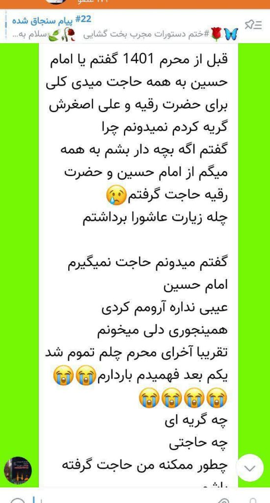 این بخش مخصوص کسانی است که آرزوی مادر شدن دارند. با توسل به امام حسین (ع) و خواندن زیارت عاشورا از خداوند برای برآورده شدن حاجت بارداری و داشتن فرزند دعا میکنند.